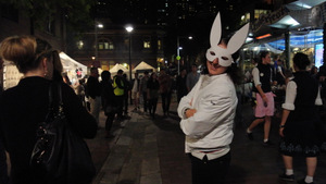 Poi saliamo a the rocks e troviamo il mercatino village bizzarre del venerdì sera. Maschere da coniglio bianco, musica in cuffie singole per ballare in modo silenzioso, spettacoli e baracchini di cibo di ogni genere.